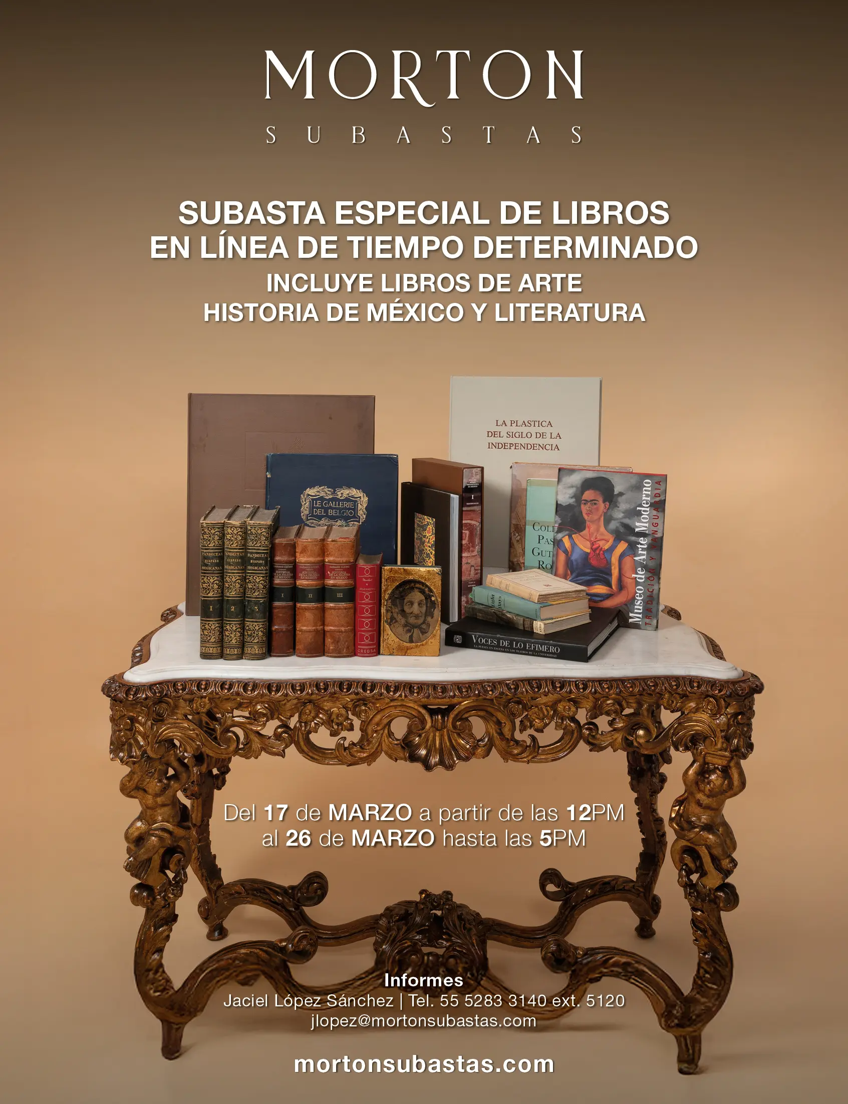 Incluye libros de arte, historia de México y literatura.